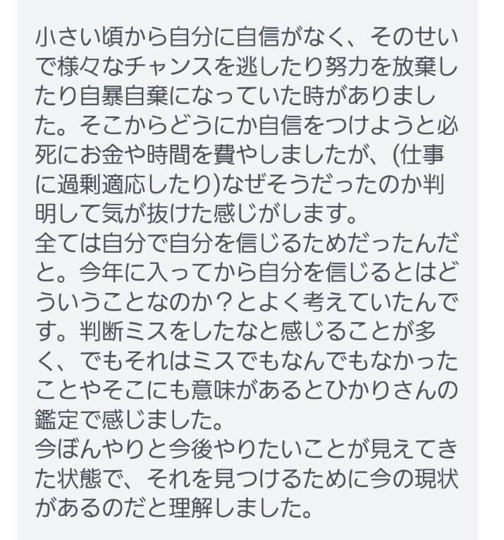 全ては自分で自分を信じるためだったんだと。今年に入ってから自分をじるとはどういうことなのか?とよく考えていたんです。判断ミスをしたなと感じることが多く、でもそれはミスでもなんでもなかったことやそこにも意味があるとひかりさんの鑑定で感じました。